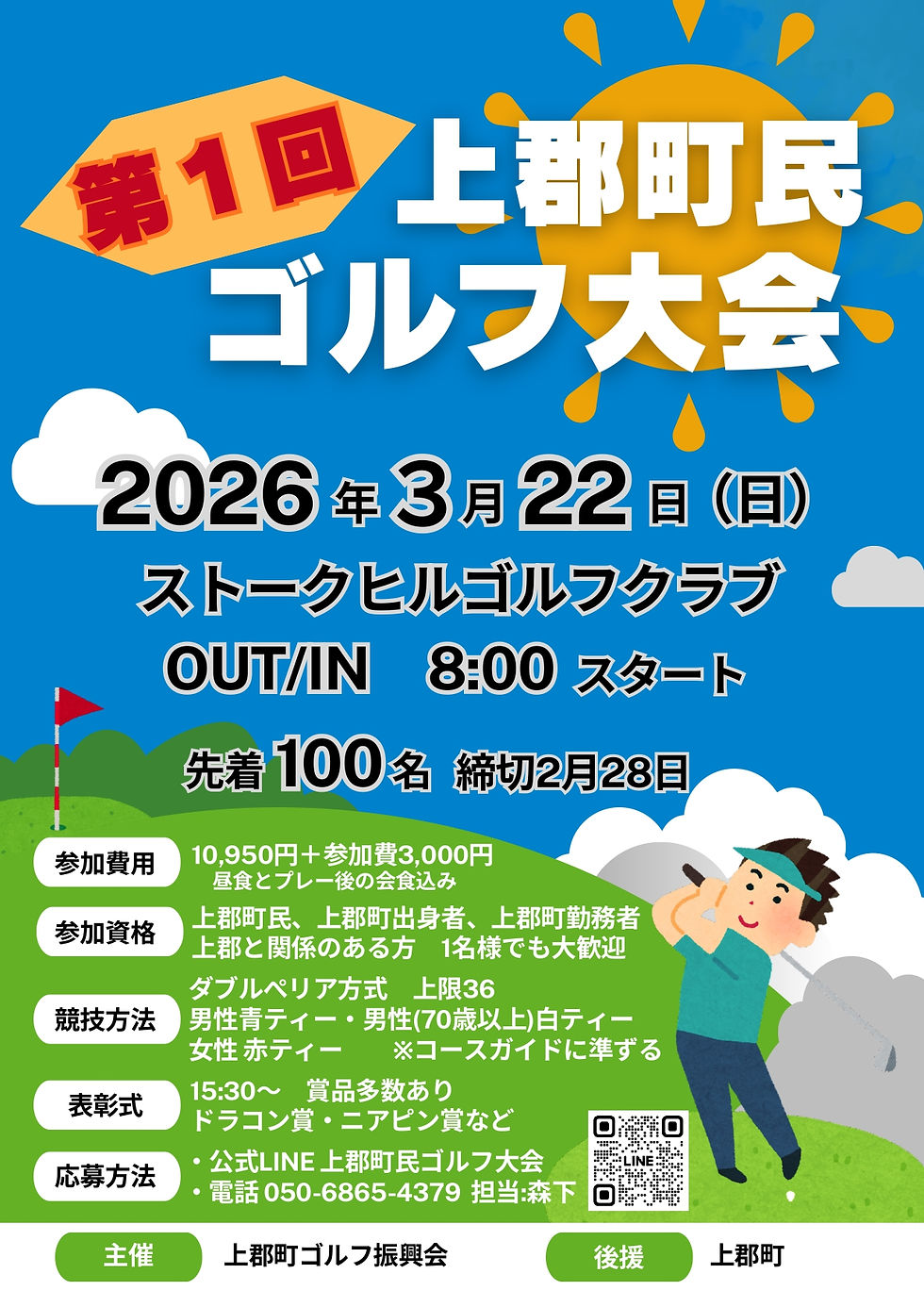 【応募方法】 ・公式LINE「上郡町民ゴルフ大会」(QRコードより) ・電話:050-6865-4379(担当:森下)
